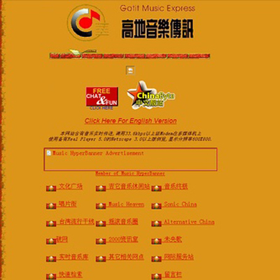 高地音乐由张秦创建于97年6月,起初是个容量仅2兆的个人网站,两个月后成为中国第一家国际顶级域名的音乐网站,提供DEMO试听,音乐人介绍等栏目,一年后还开放音乐聊天室。