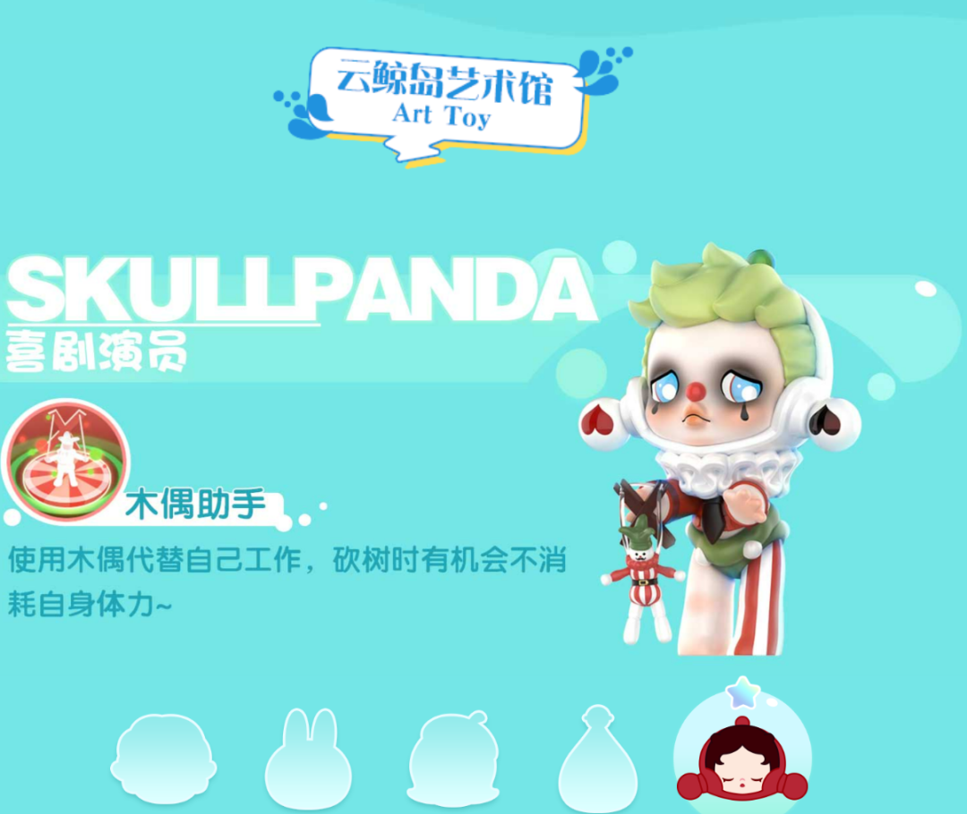 《梦想家园》游戏官网“云鲸岛艺术馆”显示,玩家可操纵形象具备各自的作用和能力:比如Labubu大娃“攀登者”能提升采矿效率;MOLLY我的小时候系列里的“你变得特别甜”,在游戏里脚踩西瓜提升移动速度; PUCKY精灵动物茶话会系列的高人气款式“小鸭宝宝”,加速农作物成熟;晋升为去年公司“销量冠军”的SKULLPANDA,其人生如戏系列的“喜剧演员”,在游戏里将有助于伐木时保存体力。