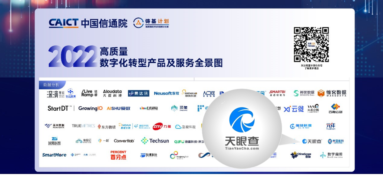 今年3月,中国信通院重磅发布了《高质量数字化转型产品及服务全景图(2022)》,天眼查凭借产品服务及品牌实力成功登榜,作为商查行业的领军企业,天眼查发挥的赋能价值获得权威机构肯定。如今,立足全行业数字化转型的关键时期,天眼查将始终保持敏锐的市场洞察和灵活的产品演进,前瞻性地研发和布局智慧解决方案,助力政府及企业客户高效、高质实现数字化升级。