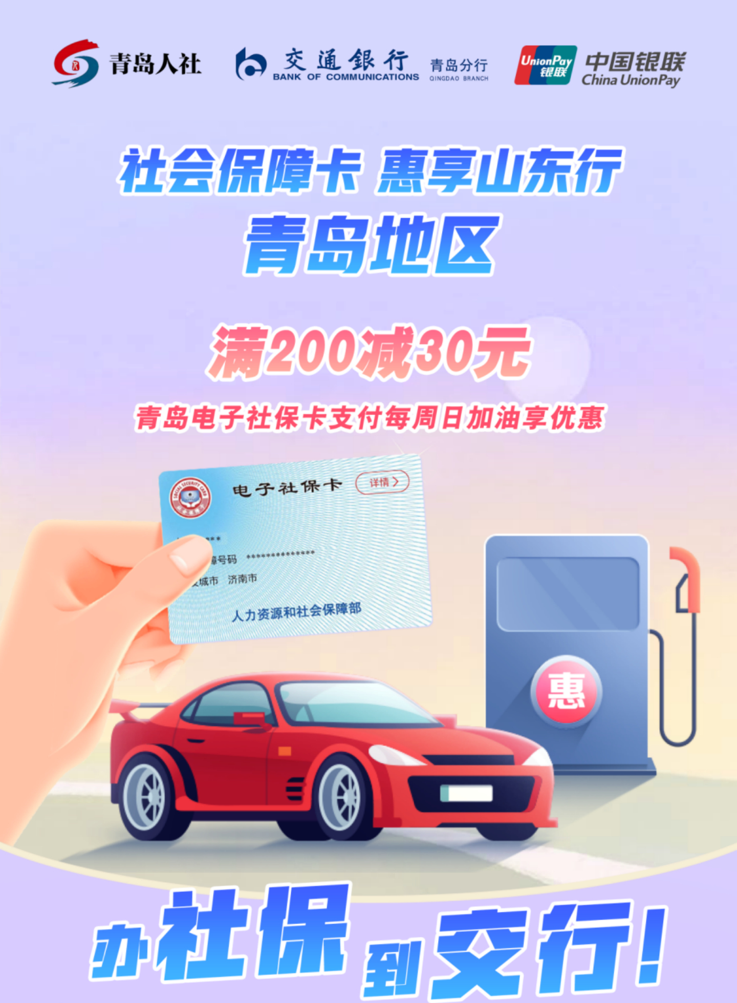5月13日山东省人力资源社会保障厅和省商务厅联合启动“社会保障卡 惠享山东行”系列活动,5月14日,青岛交行作为首批活动参与行,正式启动了用电子社保卡在中石油和中石化指定加油站加油支付“满200元减30元”的优惠活动。温馨提示:还没有办理青岛社保卡的市民可到交通银行任意营业网点现场申领,立等可取。