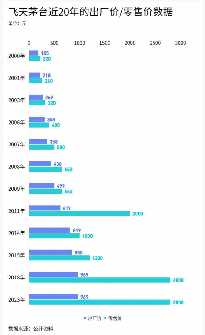 中国白酒品牌在追求经营的“闯关东”过程中,往往是U模式和T模式并行,又以U模式为主的。值得注意的是,随着经济增速减缓,U模式的持续性和空间力度消退值得警惕。看一组飞天茅台近20年的价格数据: