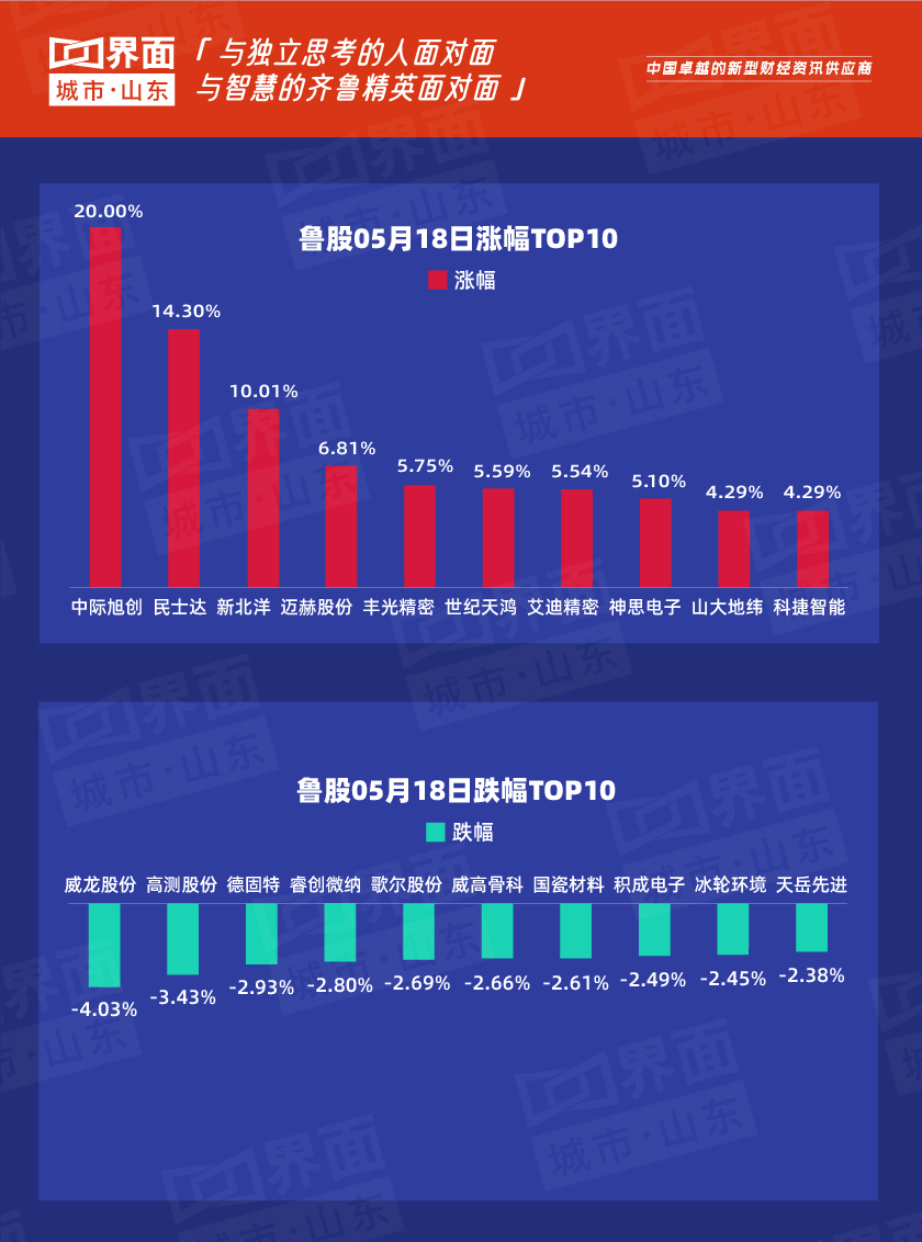 5月18日,山东省内沪深京股票有131只个股上涨,152只个股下跌;总市值过千亿的有万华化学(600309)、海尔智家(600690)、兖矿能源(600188)、青岛啤酒(600600)、中航沈飞(600760)、山东黄金(600547)、潍柴动力(000338)共7家,500亿-1000亿的共有6家,分别是中际旭创(300308)、华鲁恒升(600426)、歌尔股份(002241)、华电国际(600027)、浪潮信息(000977)、中泰证券(600918)。