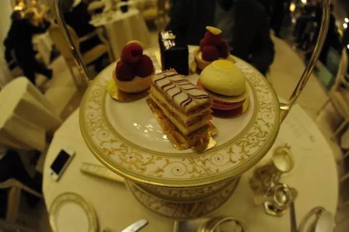 其中一套标准的英式下午茶必备:茶、三明治、蛋糕和甜点。