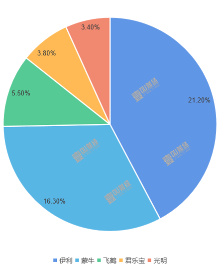 一直以来,伊利与蒙牛被公认为是中国乳业的两大巨头。国家统计局数据显示,按销售金额统计,2022两大巨头分别占据了21.2 %、16.3%的市场份额。排在其后的是光明、君乐宝和飞鹤。