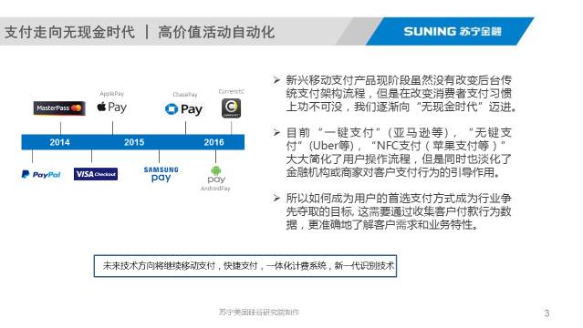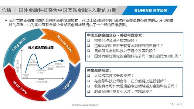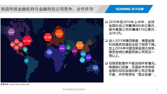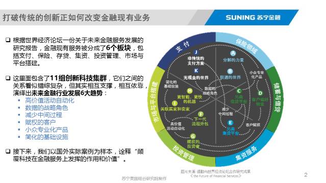 中国互联网金融行业这两年整体爆发,融资增速已超越美国,但融资数据并不能说明所有情况。现阶段,国外金融领域已经形成“竞合发展”,创新公司和传统金融服务既有竞争又有合作。这种共存共赢模式对于中国避免金融创新造成虚拟经济、脱离实体经济过度膨胀有借鉴意义。在此,苏宁美国硅谷研究院引用2015年世界经济论坛发表的一份深度研究报告,在其精髓分析框架基础上,套用多个国外创新案例,具体形象地诠释未来金融服务的竞合发展(参见以下PPT组图)。