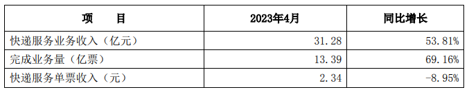 申通快递5月18日发布2023年4月经营简报,4月快递服务业务收入31.28亿元,同比增长53.81%。