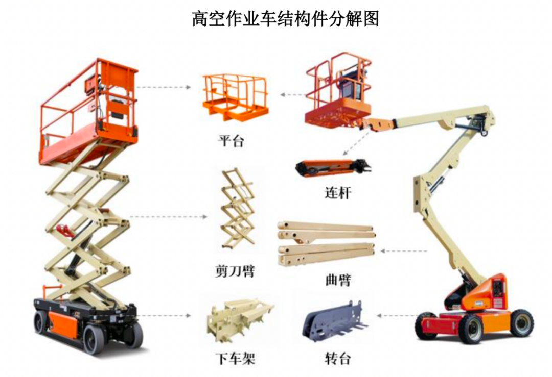 以高空作业车为例,它可以将作业人员、工具、材料等通过作业平台举升到指定位置进行各种安装、维修操作,而金成股份所生产的高空作业车结构件,主要为剪叉式高空作业车的平台、剪刀臂、下车架,以及臂式高空作业车的平台、连杆、曲臂和转台等。