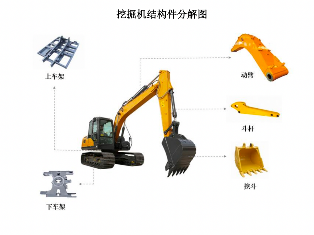 金成股份所生产的挖掘机结构件,则主要包括上车架、下车架、动臂、斗杆和挖斗等。