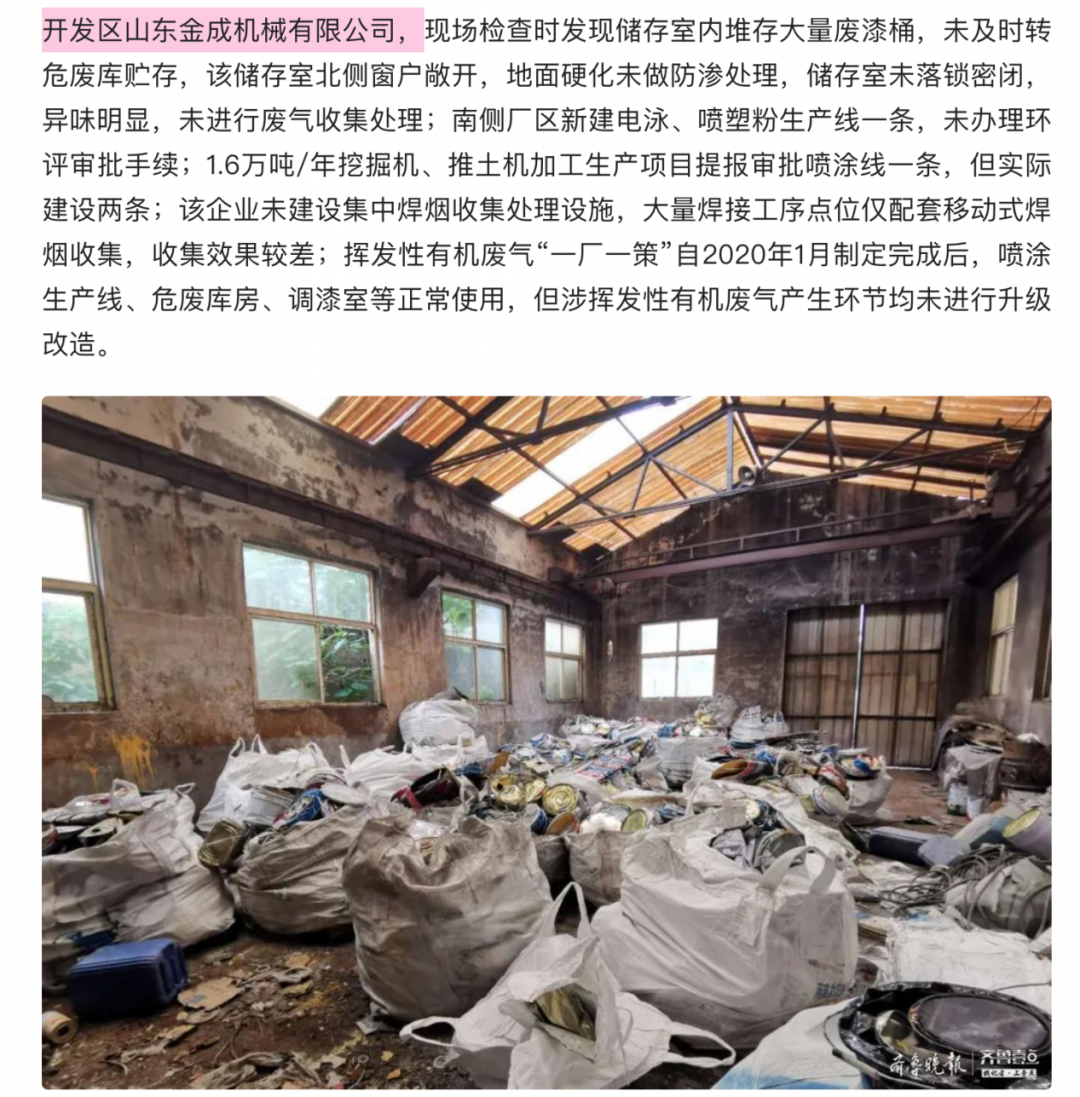 报道显示,汶上县开发区山东金成机械有限公司(金成股份曾用名),在被济宁市生态环境局在现场检查时,发现存在以下问题:未进行废气收集处理;未办理环评审批手续;审批项目与实际建设项目不符;未建设集中焊烟收集处理设施;挥发性有机废气产生环节均未进行升级改造。