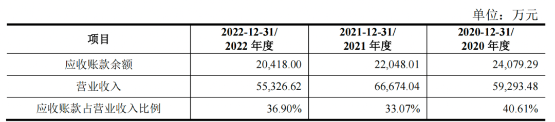报告期内,金成股份的应收账款余额分别为2.41亿元、2.20亿元和2.04亿元,占当期营业收入的比例高达40.61%、33.07%和36.90%。