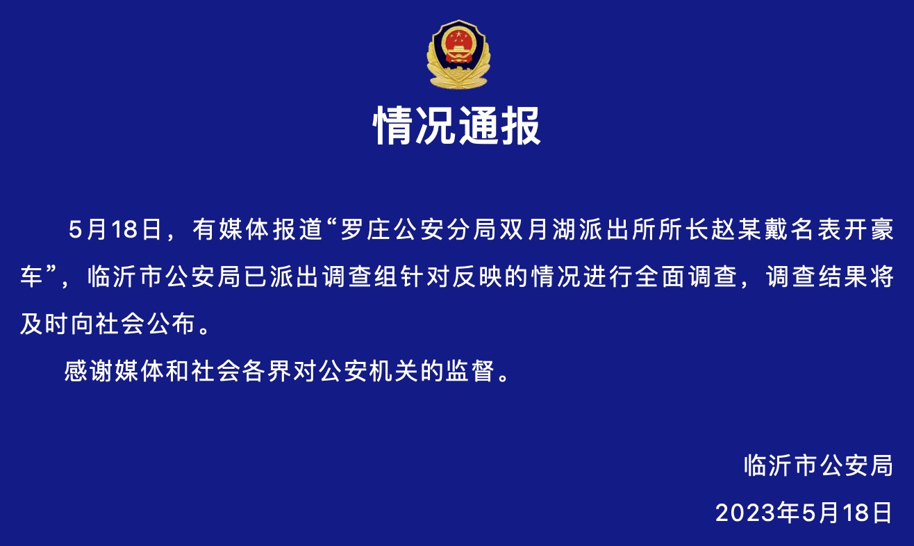 临沂市公安局发布情况通报称,5月18日,有媒体报道“罗庄公安分局双月湖派出所所长赵某戴名表开豪车”,临沂市公安局已派出调查组针对反映的情况进行全面调查,调查结果将及时向社会公布。