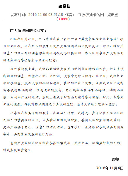 云南文山新闻网今日刊发文山市代理市长龚卿就“辱苗言论”的致歉信,龚卿表示,几天来,他积极主动配合调查,反思大家的批评和质疑,多次回忆会上发言,虽然主观上没有侮辱歧视苗族同胞,但通过深刻反省,自己确实存在语言不得体、举例不恰当、用词不严谨的地方,客观上造成了对苗族同胞情感的伤害。