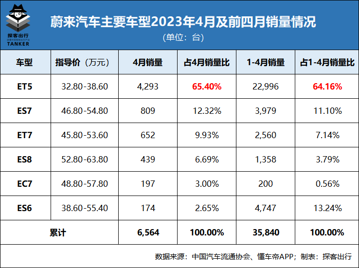而前四个月,单款ET5的总销量约2.23万台,占六款在售车型的64.16%,其次ES6和ES7的销量占比分别为13.24%和11.10%。