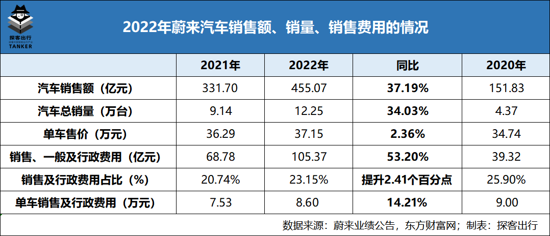 通常来说,随着产销量的提升,销售、一般及行政费用会逐步被摊薄,而蔚来2022年年报给出的数据却不降反增。