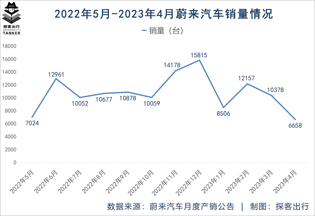 数据显示,蔚来在2023年4月实现新车销售6658台,同比增长31.20%,环比下降35.85%。不仅远低于理想,甚至都不及小鹏,这也是蔚来继3月销量下行后的再次下滑,并创下了近一年(2022年5月到2023年4月)单月销量最低的记录。