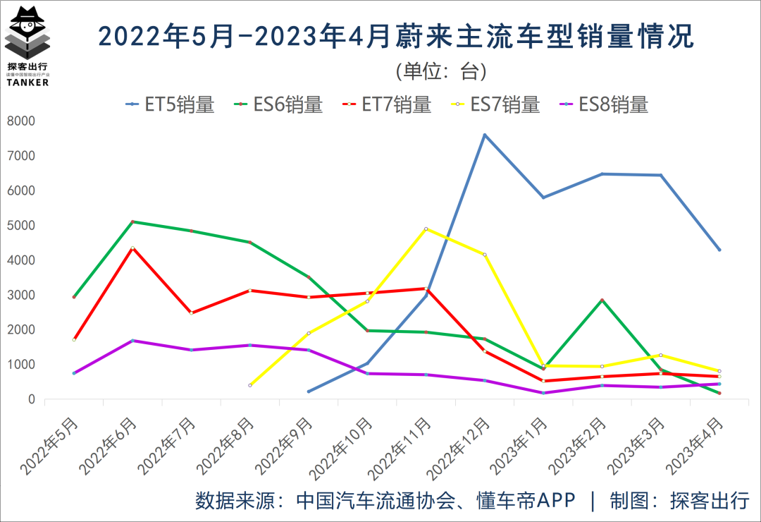 至于ES6、ET7和ES8三款在售的“老款”车型,均在2022年6月实现单月销量触顶后,便转入了明显下行走势。其销量变化虽然没有ET5和ES7这般大起大落,但也从2022年三季度的月销数千台下滑至2023年一季度的月销数百台。