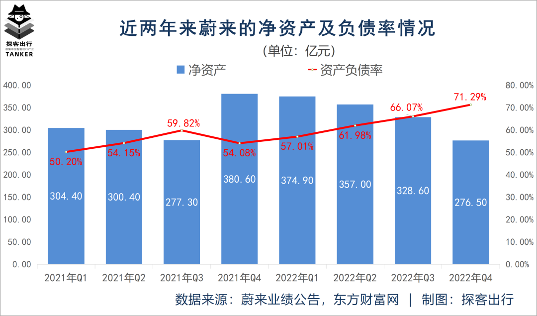 财报数据显示,截至2022年末,蔚来资产总额约962.60亿元,同比增长16.14%;负债总额约686.20亿元,同比大增53.10%。净资产约276.50亿元,同比下降27.35%。由于负债增速远大于资产增速,净资产出现明显缩水的同时资产负债率高达71.29%,比上年末增加了17.21个百分点。