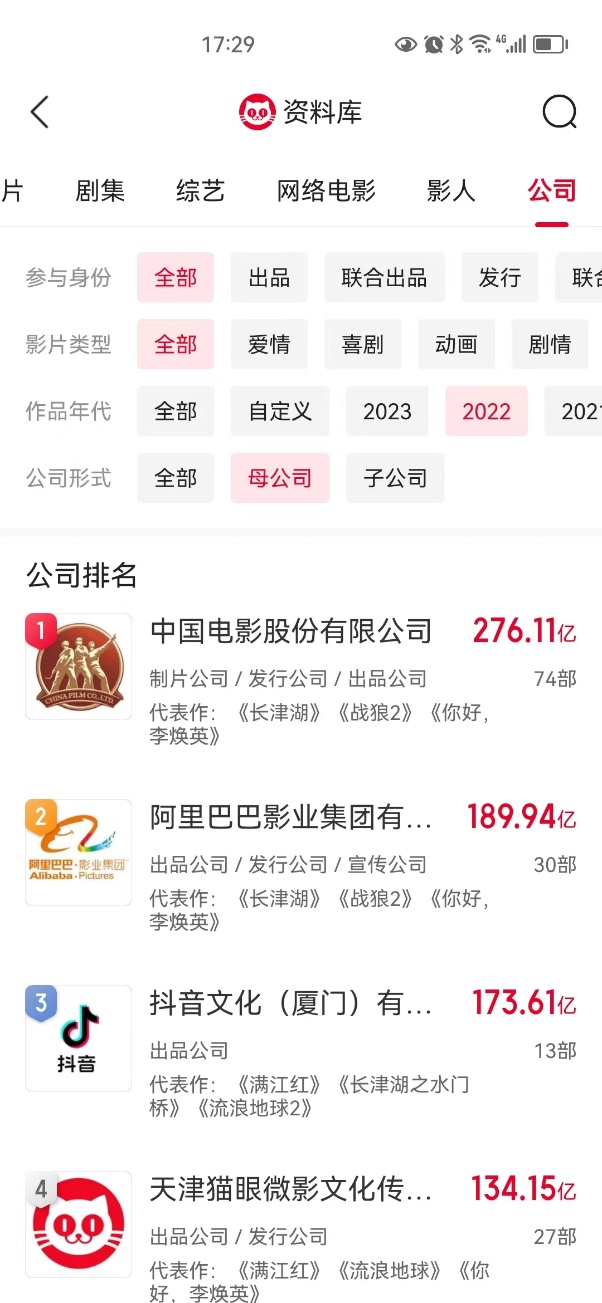 猫眼公司资料库显示,抖音文化参与的电影票房排在2022年、2023年所有电影公司第三名。其中2022年参与13部、总票房173.61亿元,2023年迄今11部,总票房截止目前已达119.87亿。
