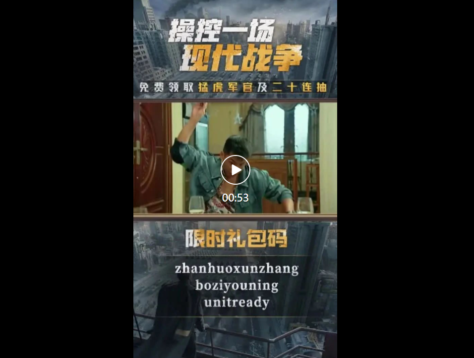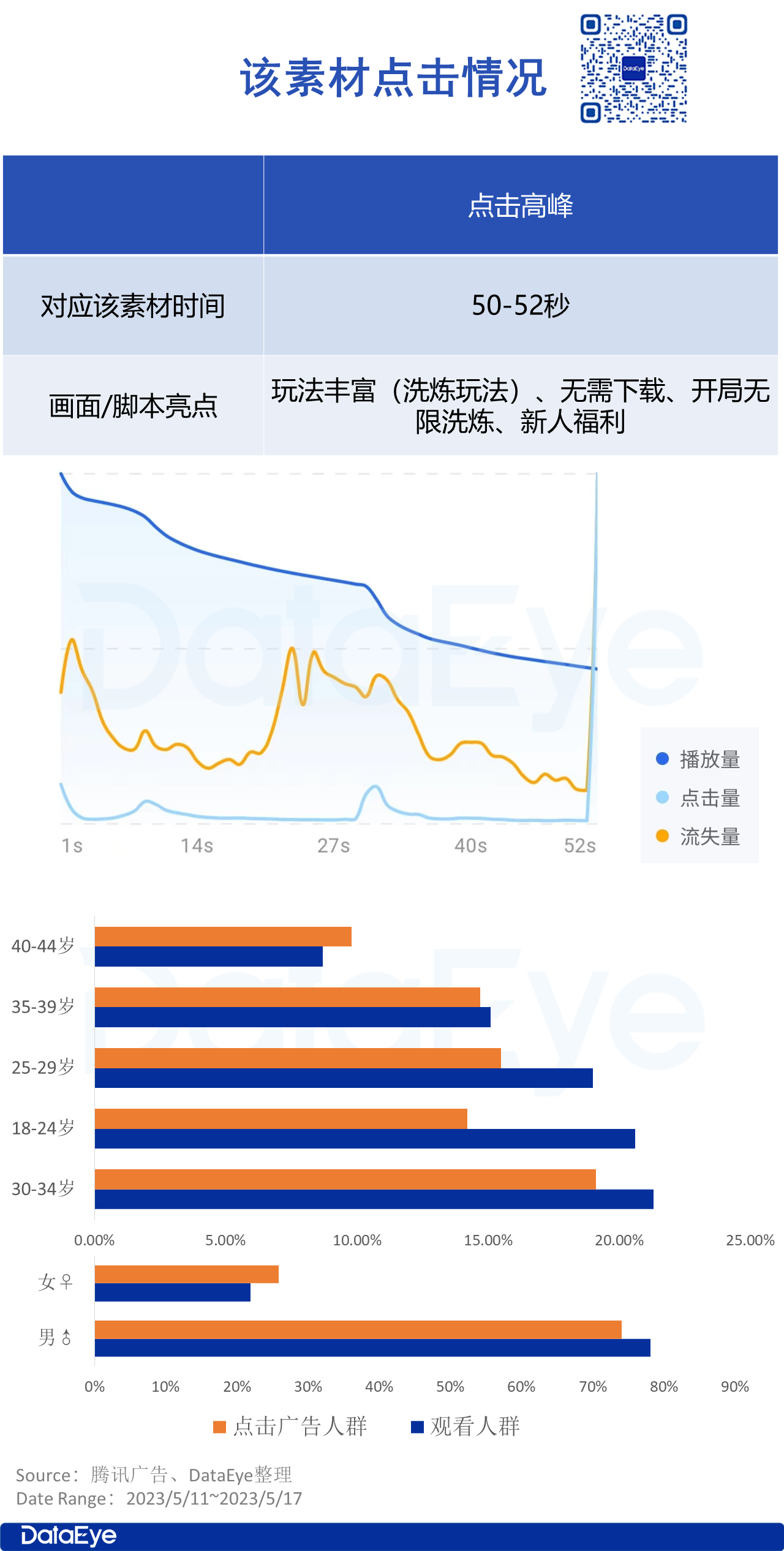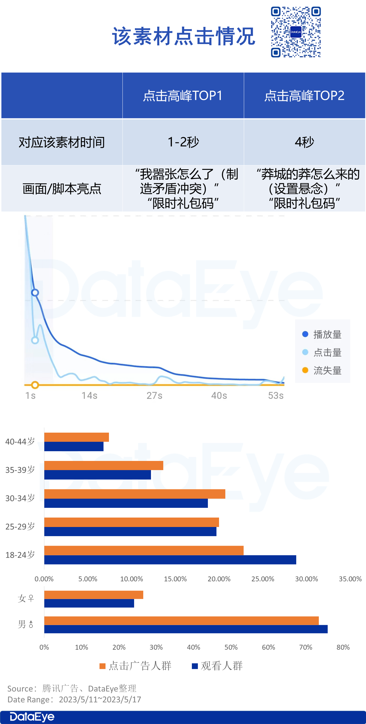 2、从转化点来看:本素材两次点击高峰依然出现在开头前4秒。视频下方一直展示“限时礼包码”,上方展示“免费领取猛虎军官及二十连抽”,包括标题的“上线就领新人福利”,都是【产生利益】转化点。