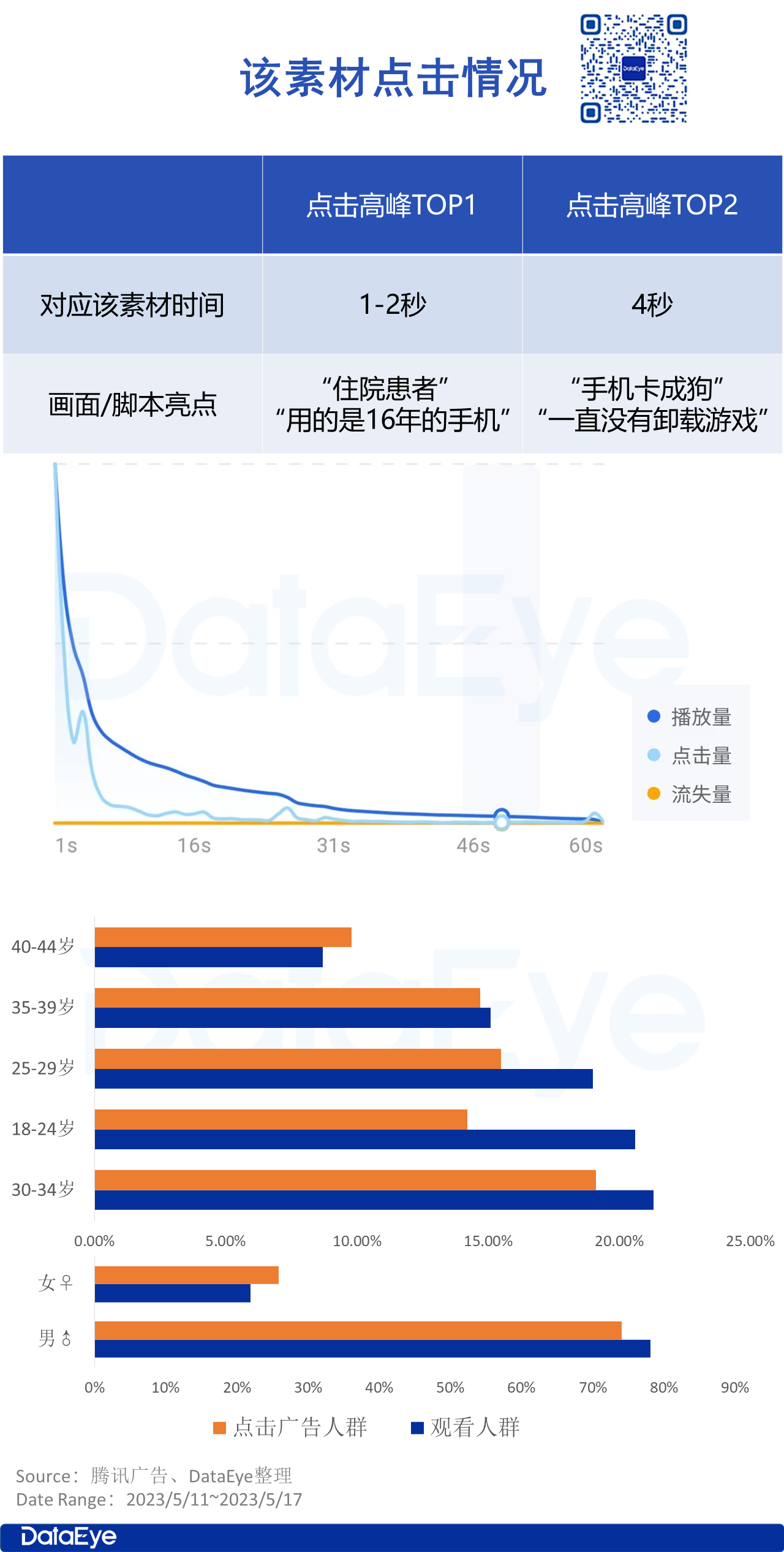 2、从转化点来看:本素材两次点击高峰均出现在开头前4秒,预计是素材标题里“免下载,不肝不氪,点击即玩!”这几个字发挥作用【降低门槛】【好奇尝试】。同时,看着病人还在兴奋玩手机,玩家也想点一点看看,玩家舍不得卸载的“到底是什么样的游戏”?【好奇尝试】