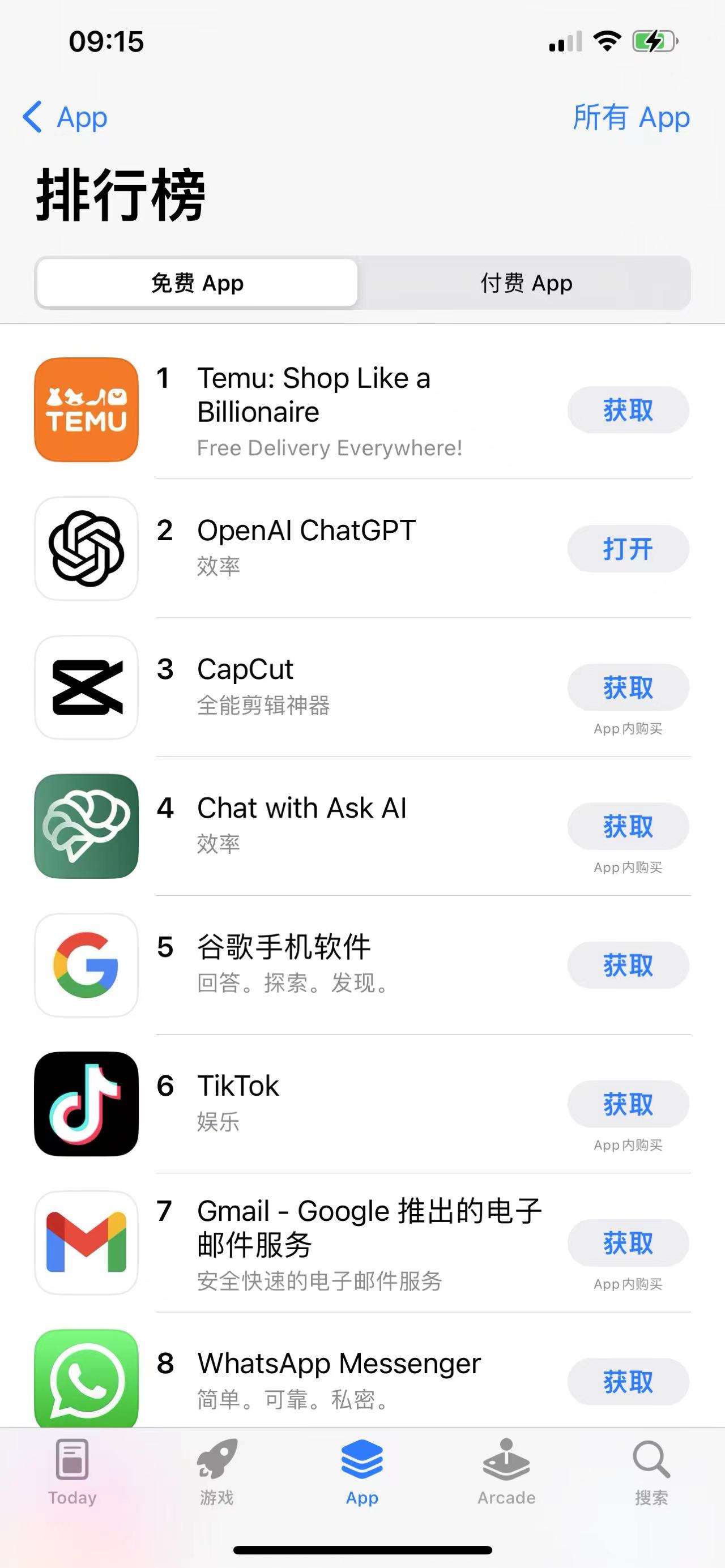 目前,OpenAI ChatGPT在美区App排行榜上位列第二,排名第一位的是美版拼多多Temu。