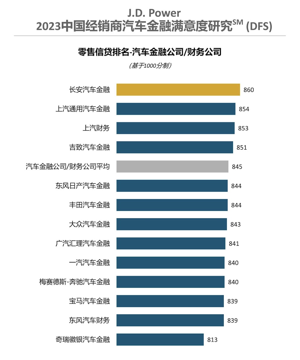 从公司方面看,长安汽车金融以860分斩获榜首,上汽通用汽车金融和上汽财务以854分及853分的差距紧随其后。汽车金融及财务公司的平均满意度下滑至845分,上榜公司中,奇瑞徽银汽车金融公司垫底。