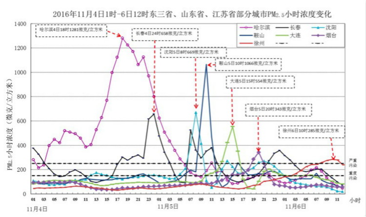 据中国环境监测总站大气室主任宫正宇研究员介绍,11月2日至6日,我国东北、华北和华东地区出现大范围重污染过程。东北地区相继有10个城市的AQI(空气质量指数)达到最高值500,其中黑龙江哈尔滨市、绥化市和大庆市等3个城市AQI达到500的持续时长分别为14小时、23小时和24小时。哈尔滨市污染最为严重,11月4日的PM2.5日均值和小时值分别达到704微克/立方米和1281微克/立方米,大庆市PM2.5小时值也超过1000微克/立方米。5日,东北地区的污染范围进一步扩大,哈尔滨市、牡丹江市、吉林市、七台河市、大连市、锦州市、葫芦岛市等7个城市小时AQI为重度污染,齐齐哈尔市、大庆市、绥化市、长春市、松原市、鞍山市、营口市、辽阳市、本溪市、盘锦市、白城市、双鸭山市、阜新市等13个城市小时AQI为严重污染,其中长春市、松原市、沈阳市、大连市、鞍山市、白城市、辽阳市和营口市的小时AQI达到最高值500,鞍山市PM2.5小时值超过1000微克/立方米。5日夜间至6日上午,受东北地区污染传输影响,山东省烟台市、潍坊市、青岛市、日照市、枣庄市,江苏省徐州市、宿迁市,安徽省淮北市、亳州市相继出现重度以上污染。