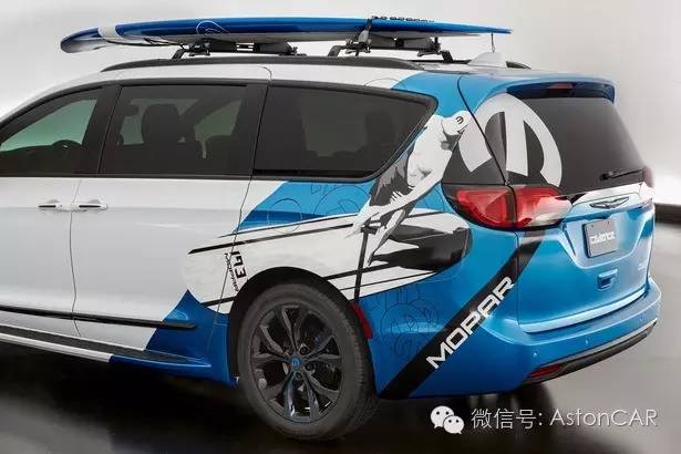 最后的这辆Pacifica改装车,主打“家庭空间”概念,蓝白的车身设计非常养眼。除了必备的车顶行李架以外,还能将Stow'N GO座椅折叠并收进地板内,从而扩大车室空间。另外还预留了宠物空间,提供全气候地板、无线充电设备、克莱斯勒专用急救箱等。简而言之,就是营造家居般的空间感和舒适安定感。