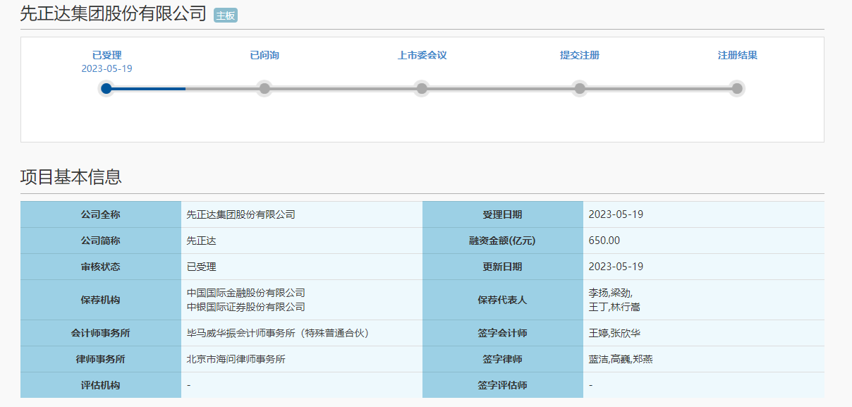 5月19日,上交所发行上市审核平台显示,先正达在上海主板提交的IPO申请获得受理,拟融资金额650亿元。