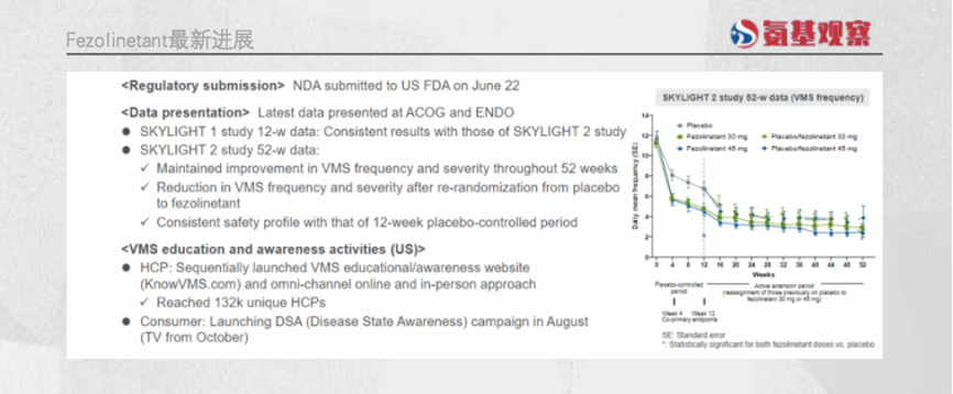 在SKYLIGHT 1和SKYLIGHT 2试验中,为1022名40至65岁患有中度至重度血管舒缩症状的女性每日口服一次Veozah® (30mg和45mg)的疗效和安全性,同时进行安慰剂组对照。通过两项试验的结果可以发现,与安慰剂相比,服用45mg Veozah®的中度至重度血管舒缩症状的频率和严重程度,从基线到第4周和第12周在统计学上均实现了显著性的降低,两项临床中分别减少2.6次和2.5次。与传统HRT相比,fezolinetant作用起效更加迅速,并能持续数周。