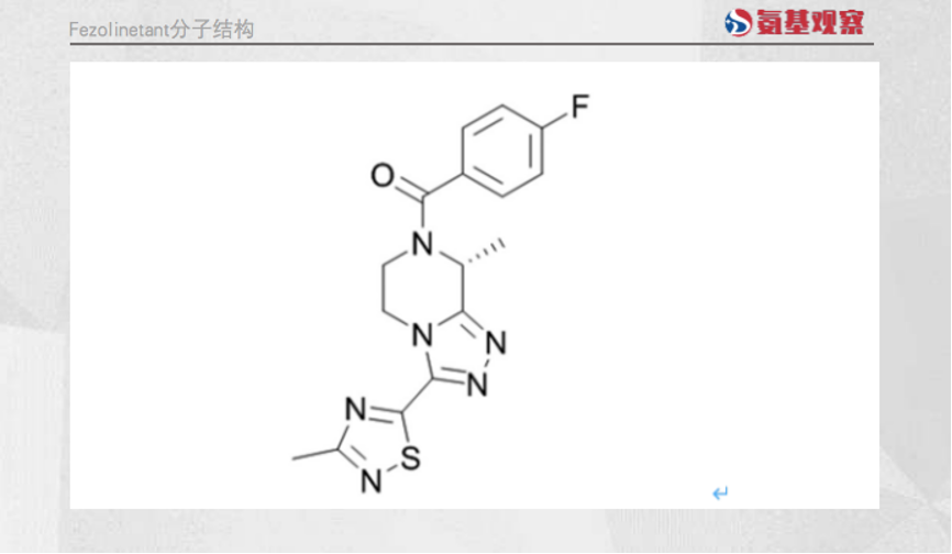 Fezolinetant是一款口服、选择性神经激肽3(NK3)受体拮抗剂,通过阻断神经激肽3(NK3)与Kisspeptin/神经激肽/强啡肽(KNDy)神经元的结合,调节大脑体温调节中枢(下丘脑)的神经元活动,以降低绝经相关中重度VMS的频率和严重程度。