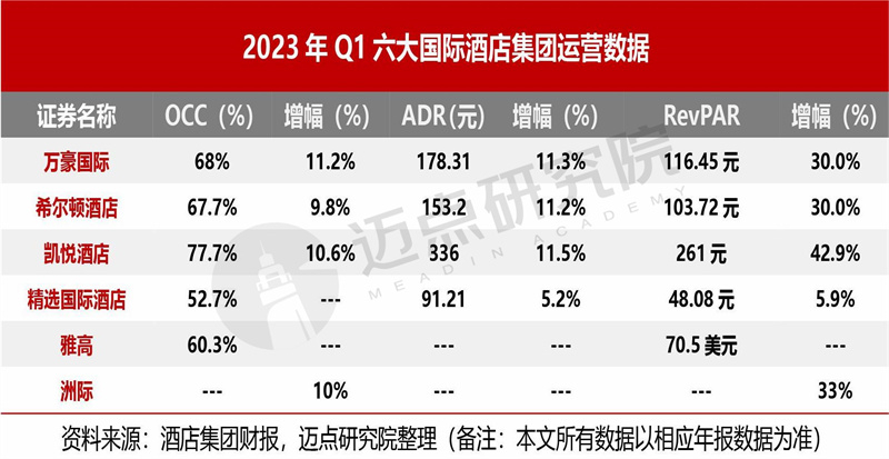 第五,雅高数据显示:2023年一季度,营业收入为12.5亿美元,同比增长54%。旗下全球RevPAR为70.5美元,比2019年同期高出19%,本季度ADR相比2019年同期增长27%。OCC为60.3%,相比2019年同期下降了4.5%。