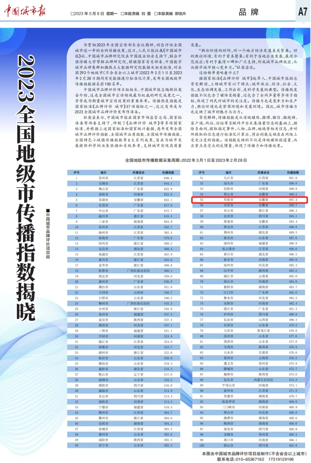 日前,2023全国地级市传播指数揭晓,加速发展的安徽阜阳以497.4居全国第55位,较前一年上升20个位次,城市影响力持续得以提升。