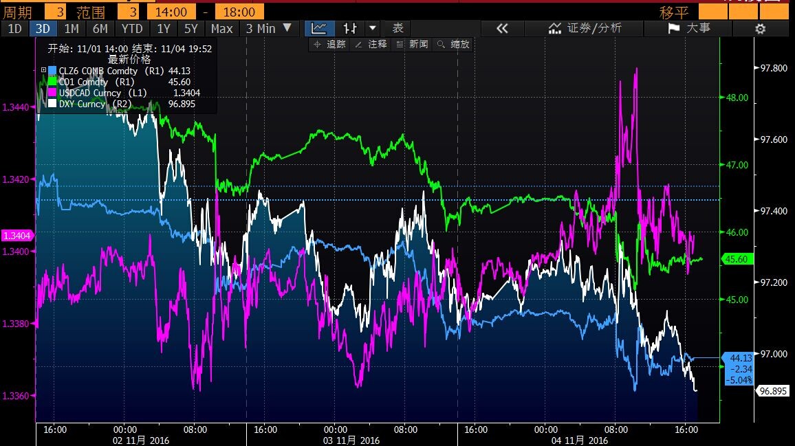 美国WTI 12月原油期货电子盘价格周五(11月4日)收盘下跌0.53美元,跌幅1.19%,报44.66美元/桶,周下跌约9%,创1月以来最大周度百分比跌幅;