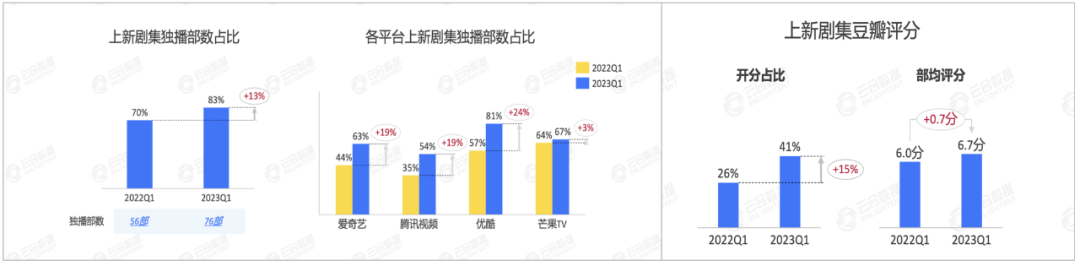 可以看到,今年一季度的上新剧集中,独播剧集(大多是平台自制)占比从70%上涨至83%,爱腾优芒各家均有增长;与此同时,豆瓣评分也整体提升。