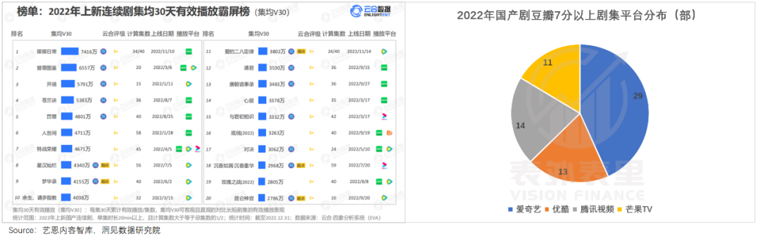 从目前表现来看,平台有所分化。数据显示,2022年上新剧集中热播top20中,爱奇艺的独播剧有7个,腾讯6个,优酷只有2个;豆瓣评分7分以上的剧集,爱奇艺同样领先。