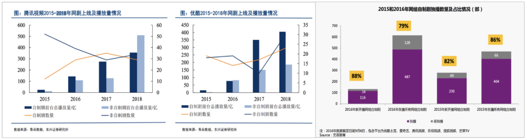 生死存亡的压力,逼迫着平台们加速奔跑。2015年之后,自制剧占比明显拉升,逐步成为各平台的流量拉动主力。