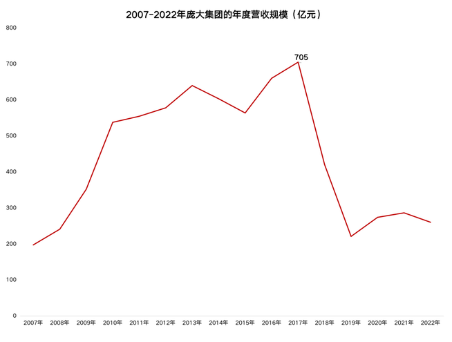 疯狂扩张之下,庞大集团的规模也大幅增长。2017年全年,庞大集团销售新车达48.17万辆,营收高达704.8亿元,创出历史最高,荣登中国500强第240位。当年庞大集团拥有的门店数超过1000家。