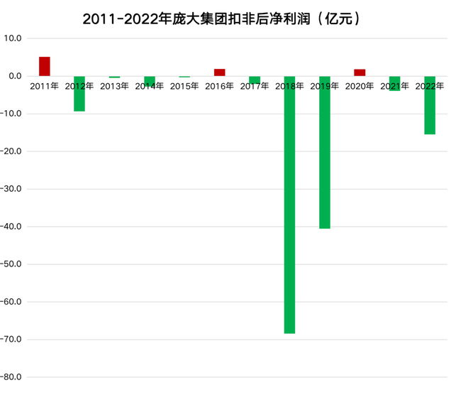 庞大集团上市12年间,庞大集团的扣非净利润仅2011年、2016年、2020年为正,即使是2017年的营收高达704亿元,但当年的扣非后净利润也巨亏超2亿元。