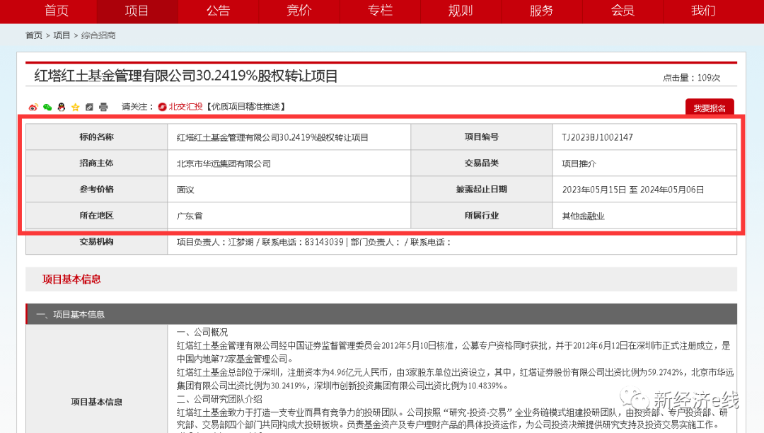 新经济e线获悉,红塔红土基金第二大股东——北京市华远集团有限公司(华远集团)拟清仓甩卖其所持有的逾三成股权。日前,北京产权交易所官网披露了一则红塔红土基金管理有限公司30.2419%股权转让项目的消息。其招商主体正是华远集团,具体参考价格面议,披露起止日期为2023年5月15日至2024年5月6日。