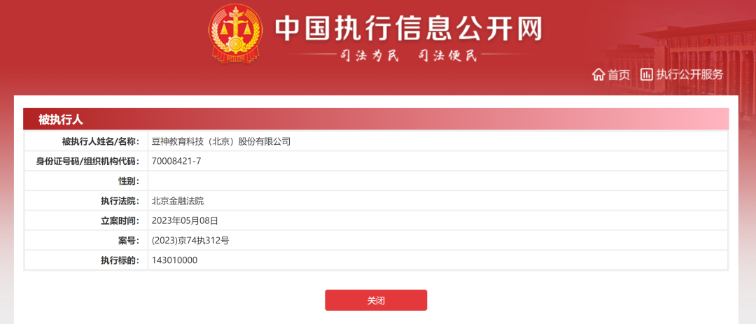 近日,据执行信息公开网信息公布,豆神教育科技(北京)股份有限公司新增被执行人信息,执行标的1.43亿元,立案时间为2023年05月08日,执行法院为北京金融法院。