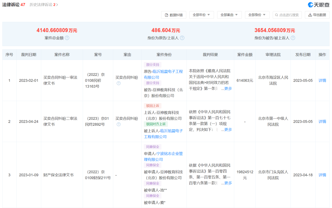 而据天眼查数据披露,截至目前,豆神教育共涉及法律诉讼47例,身为被告或被上述人的涉案金额共计3654.06万元。