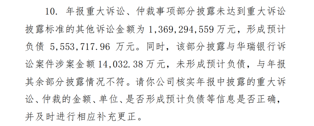 同时,深交所指出,该部分披露与华瑞银行诉讼案件涉案金额14,032.38万元,未形成预计负债,与年报其余部分披露情况不符。