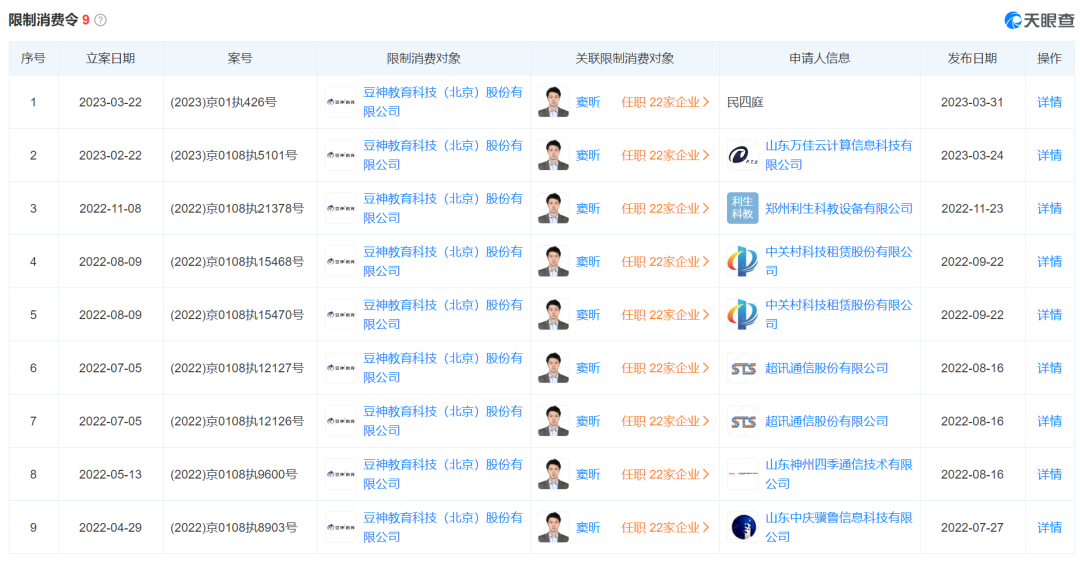 挂帅豆神教育的窦昕,也先后9次收到限制消费令,被要求不得实施包括乘坐交通工具时,选择飞机、列车软卧、轮船二等以上舱位;在星级以上宾馆、酒店、夜总会、高尔夫球场等场所进行高消费;购买不动产或者新建、扩建、高档装修房屋;租赁高档写字楼、宾馆、公寓等场所办公;购买非经营必需车辆;旅游、度假;子女就读高收费私立学校;支付高额保费购买保险理财产品;乘坐G字头动车组列车全部座位、其他动车组列车一等以上座位等其他非生活和工作必需的消费行为。