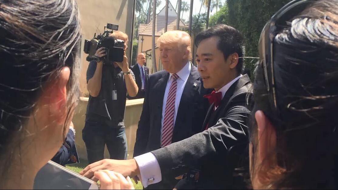 在他后来发到微信群和发给包括 NBC 在内的媒体的照片里,他再一次以领头人的角色出现,身着“华裔爱川普”的白衬衫并举着「Make America Great Again」的川普竞选口号牌,身边站着六位“追随者”,包括我们参与拍摄的白人同事。