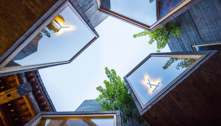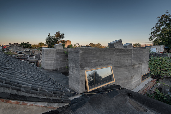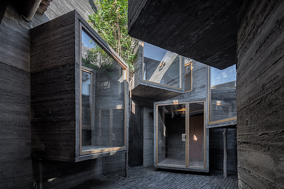 设计师想到的解决方法是围绕天井,把各个功能区块一个个摆进大窗户里。这样一来,空间各处的采光也得到了保证。而为了避免功能区在一个平面上铺开造成的割裂感,每个窗户又都是凸起的、高低左右交错而立。
