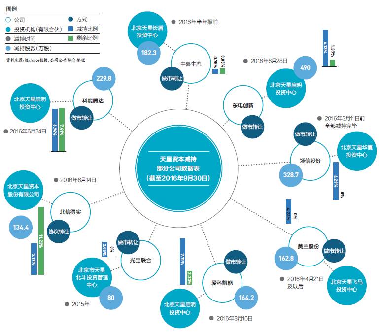 据choice数据统计,2016年以来,天星资本陆续减持了10余只股票。包括科能腾达、北信实得、光宝联合、爱科凯能、润农节水、美兰股份、领信股份、全华光电、东电创新、伟力盛世、中喜生态等。刘研声称,减持主要是为了企业的发展,配合他们做减持,此外合作伙伴也希望从他们手上接一些股票。“我们减持了部分股票,体量对于天星资本来说非常小。天星资本减持10多家在新三板市场中是微不足道的。”