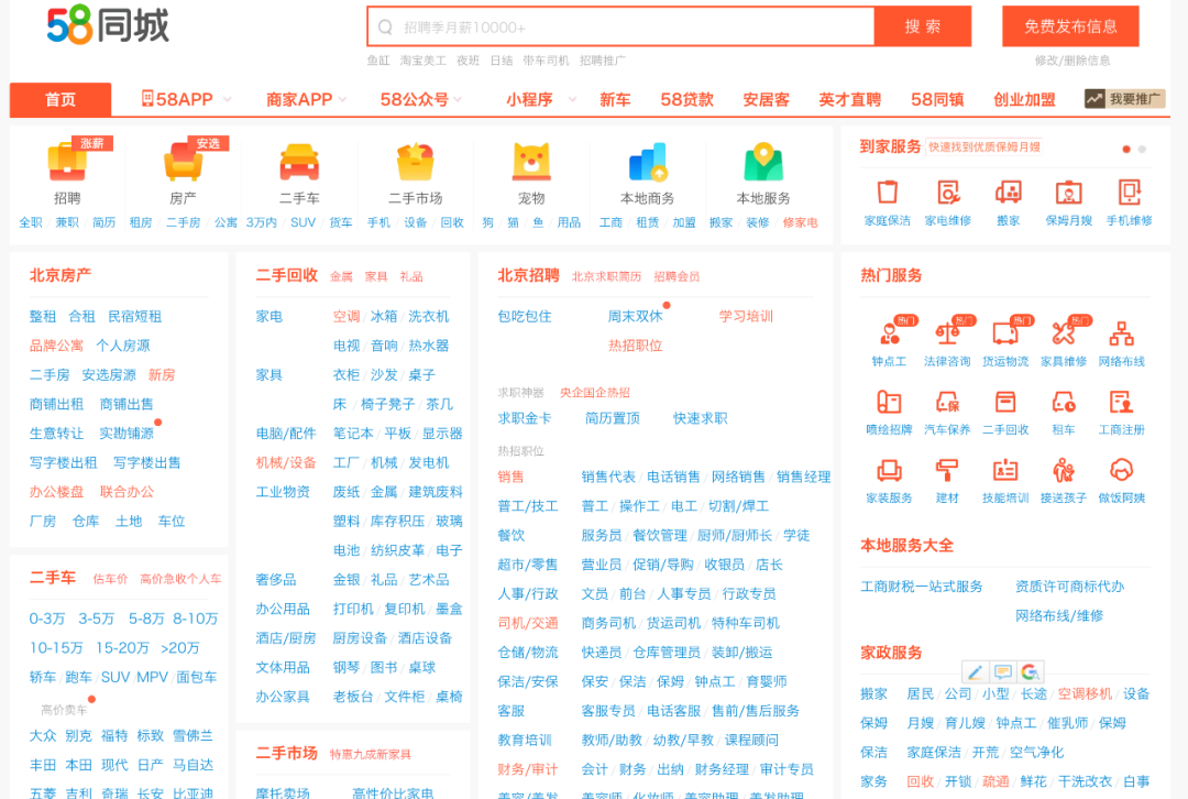 58官网首页上有诸多信息分类和入口,截图自58同城官网