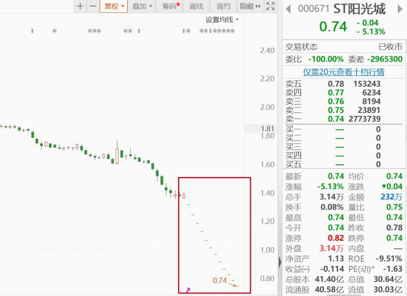 截至5月22日收盘,ST阳光城(000671.SZ,曾用简称“阳光城”)的股价已经连续出现12个跌停板,收盘价为0.74元/股,连续6个交易日收盘价低于股票面值1元。