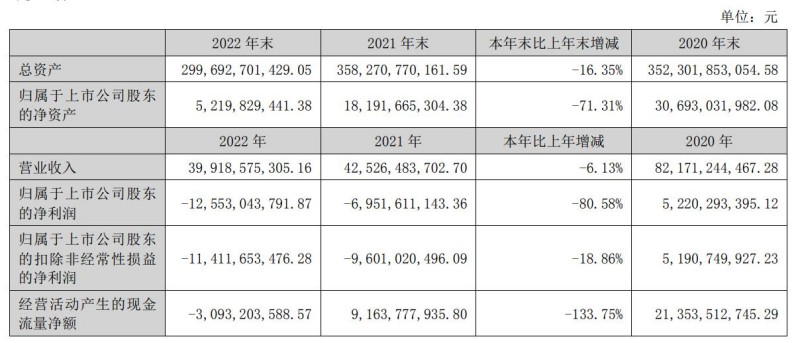 ST阳光城年报显示,2022年实现营业收入399.19亿元,同比减少6.13%;实现归属于上市公司股东的净利润-125.53亿元,出现超过百亿元的巨额亏损,而且和上年的-69.52亿元相比亏损扩大了80.58%。两年合计亏损了195.05亿元。